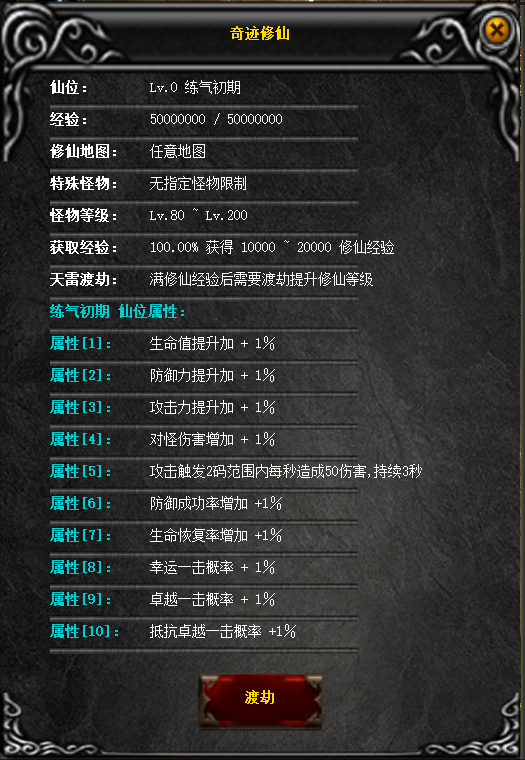 出生赠送初级修仙称号,练气初期,10项属性各赠送1%属性,一共36级修仙称号毕业。