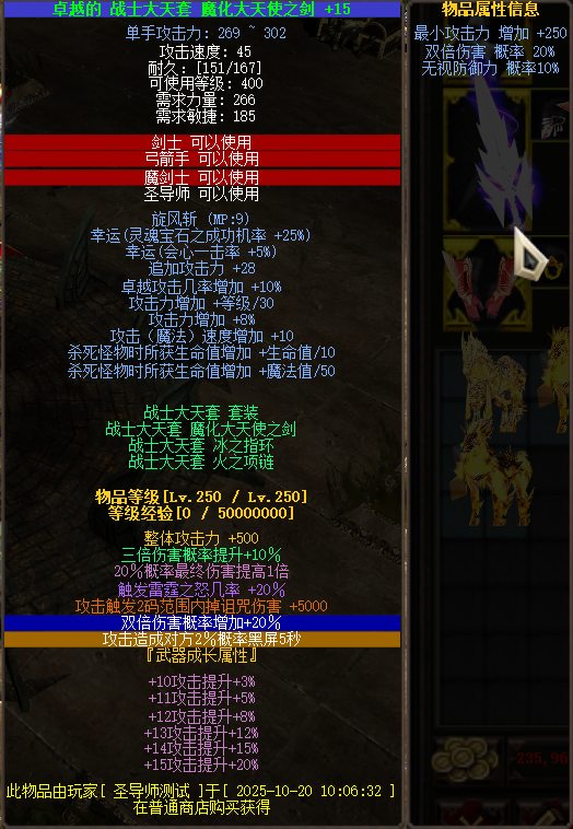 老镶嵌武器,飞升套与魔化大天套,可在黑暗沼泽打怪获得经验,满5000万经验自动升1级,满级250级,每升25级激活一次附魔属性,满级可激活10次附魔属性,盾牌为高级盾牌